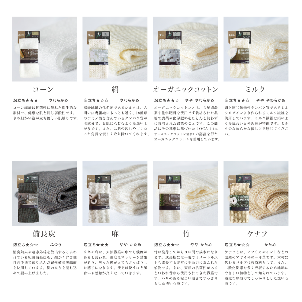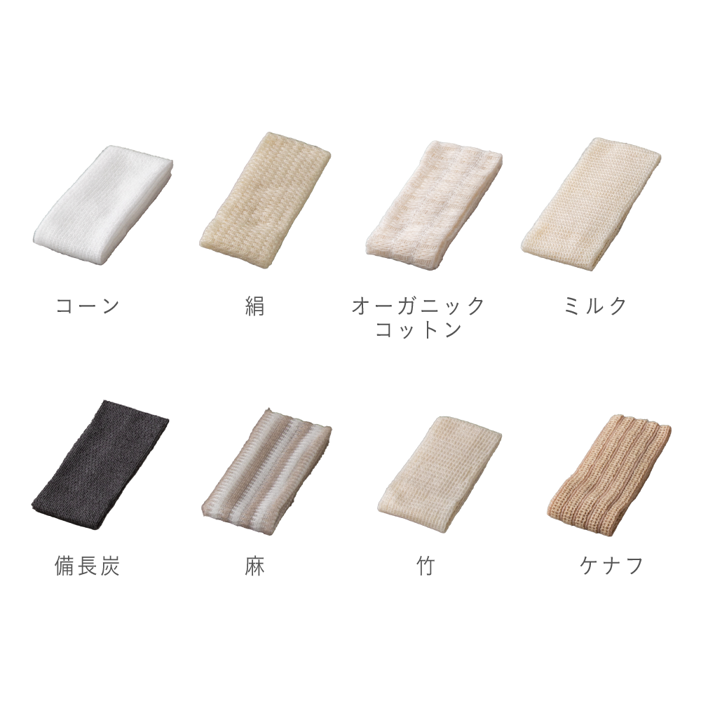 | 材質 | 竹_植物繊維(竹)45%、綿30%、ポリ乳酸25% ミルク_半合成繊維(プロミックス)60%、ポリ乳酸40% オーガニックコットン_綿50%、ポリ乳酸50% 絹_ポリ乳酸60%、絹40% 麻_ポリ乳酸50%、麻50% ケナフ_植物繊維(ケナフ)50%、ポリ乳酸25%、綿25% 備長炭_綿40%、ポリ乳酸40%、レーヨン20% コーン_ポリ乳酸100% |
