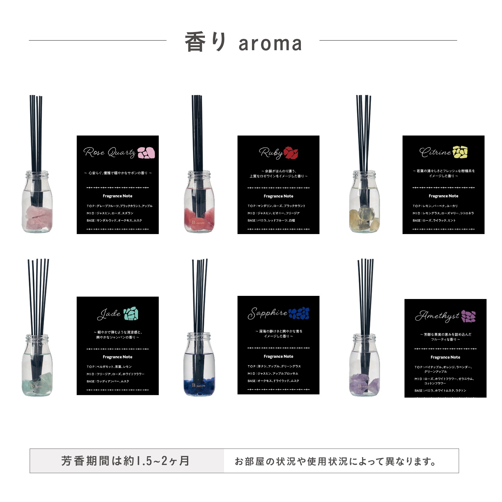 天然石の持つ自然のエネルギーが静かに広がり、ふわりと漂う香りとともに、心をほぐし、穏やかなひとときをもたらします。