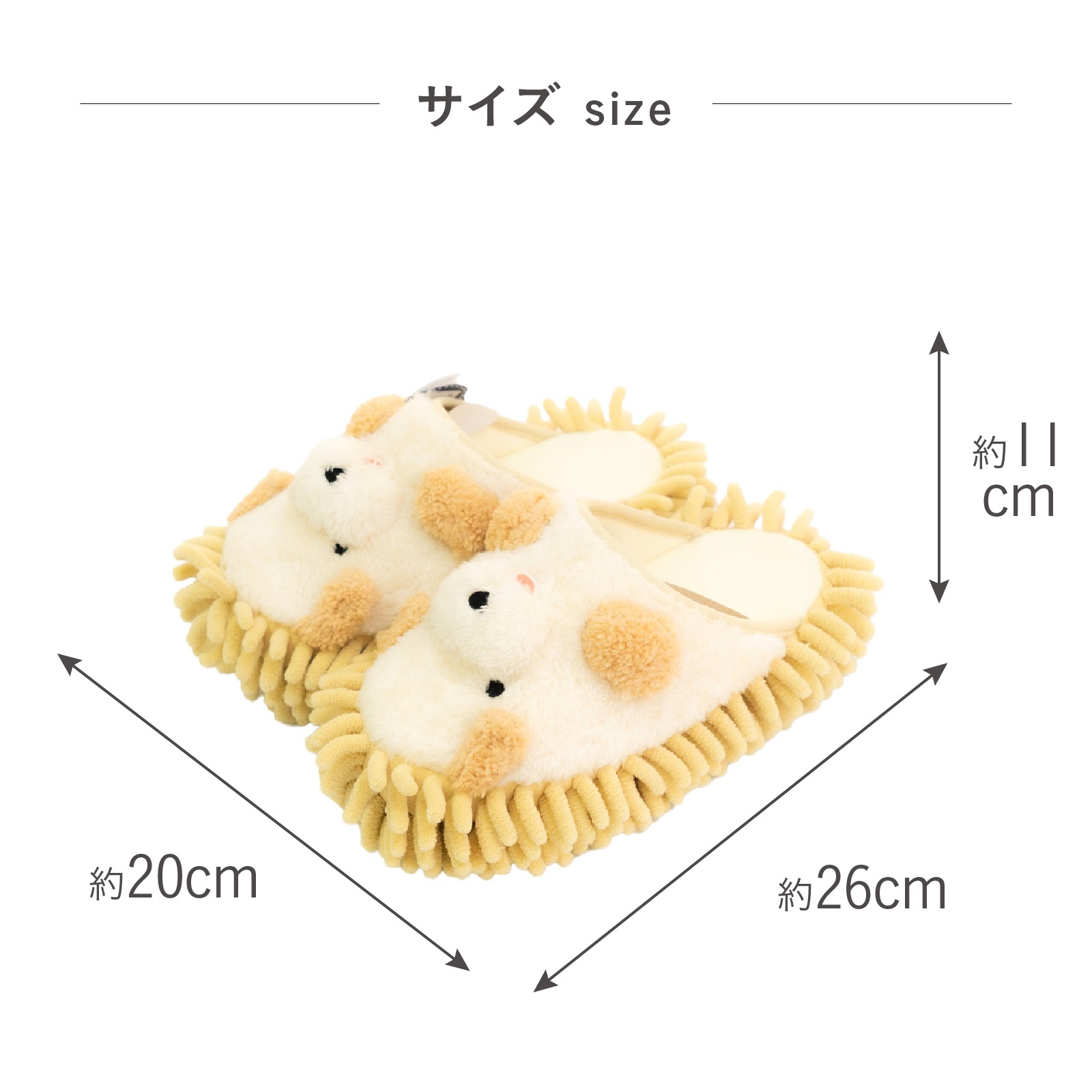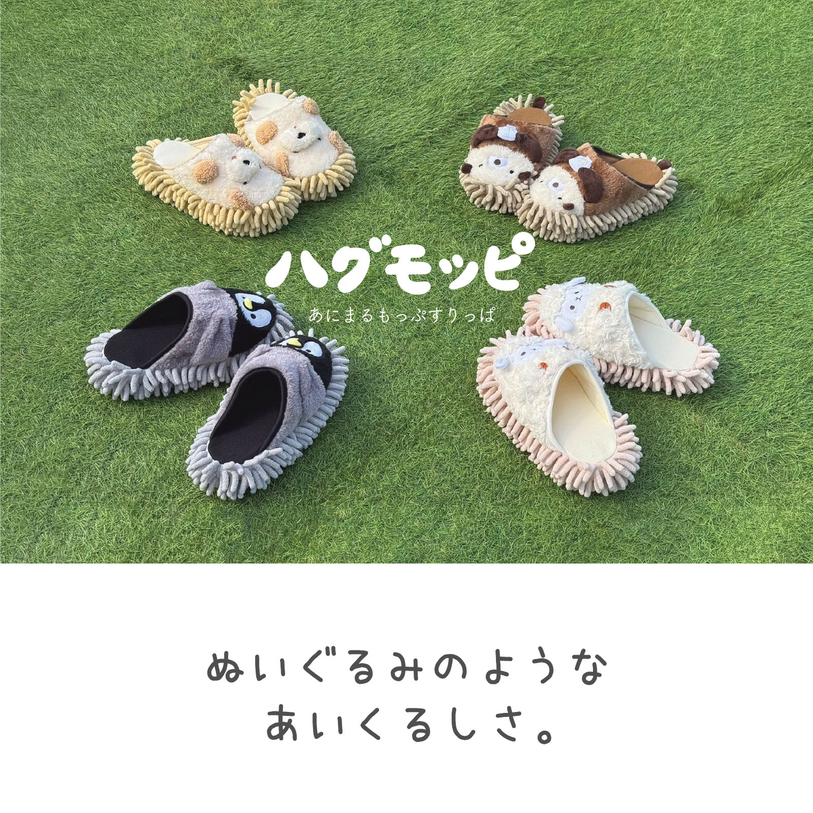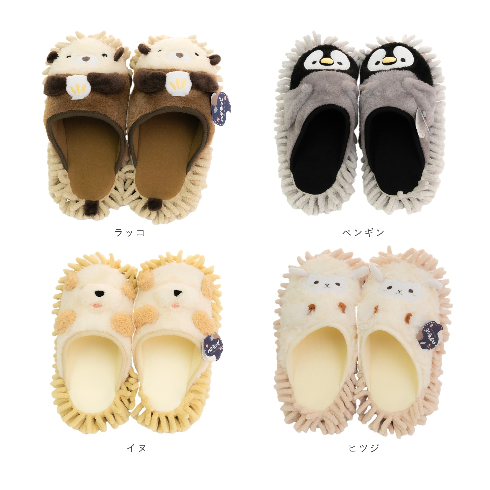 動物たちが足をぎゅっとハグをしてくれる、ぬいぐるみのようなかわいらしいお掃除モップ用スリッパです。