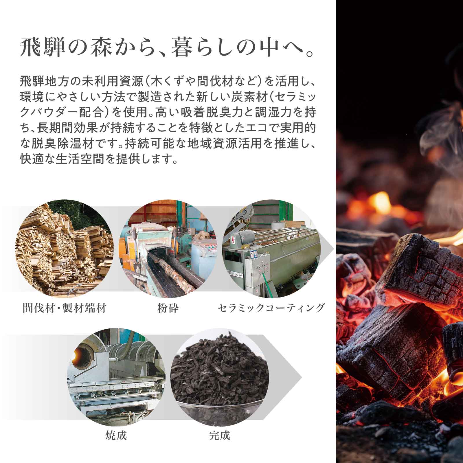 飛騨地方の未利用資源(木くずや間伐材など)を活用し、環境にやさしい方法で製造された新しい炭素材(セラミックパウダー配合)を使用。